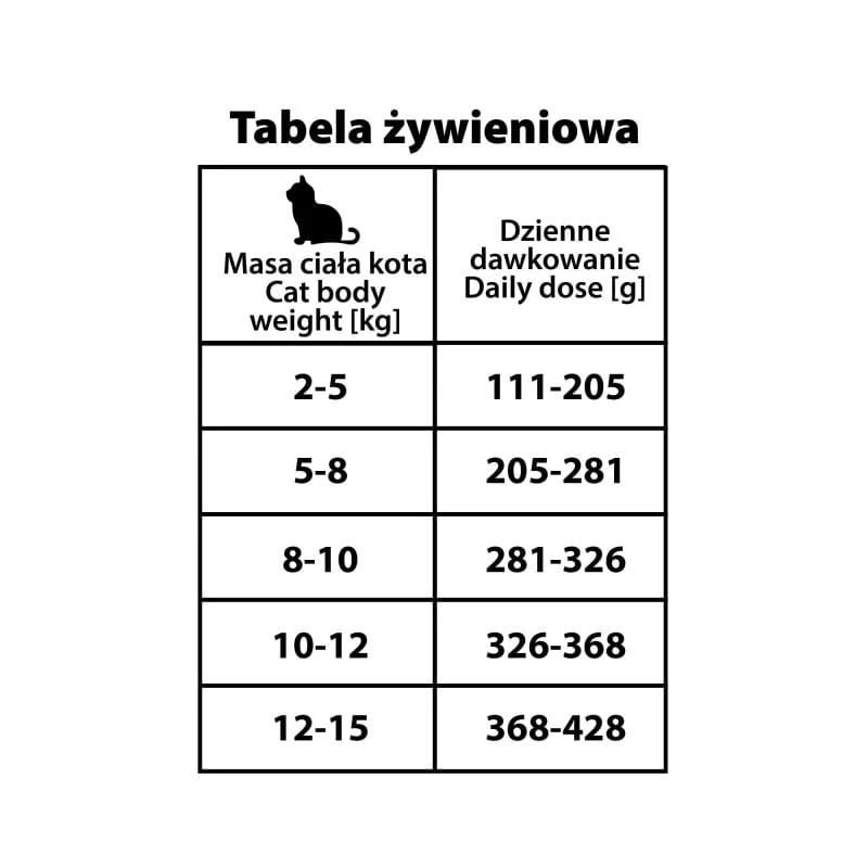 Poniższa tabela przedstawia orientacyjne dzienne dawkowanie karmy. Pamiętaj, że są to wartości sugerowane, które należy dostosować do indywidualnych potrzeb Twojego kota, uwzględniając jego wiek, rasę, poziom aktywności fizycznej oraz ogólny stan zdrowia. Zawsze zapewnij kotu stały dostęp do świeżej wody pitnej.