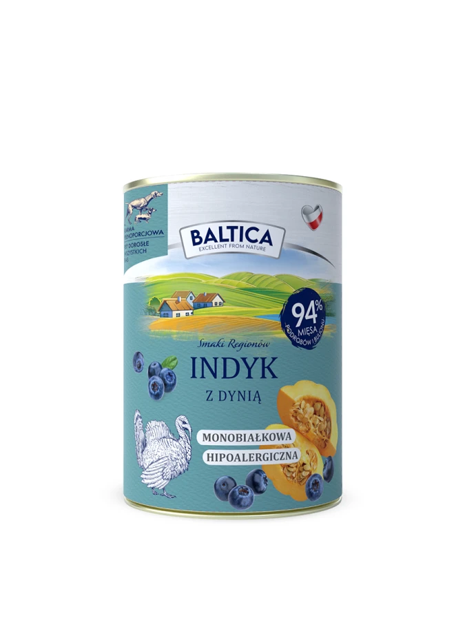 Szukasz hipoalergicznej i wyjątkowo smacznej karmy dla swojego wrażliwego psa? Baltica Smaki Regionów Indyk z Dynią to monobiałkowa receptura z 94% indyka, idealna dla psów z alergiami i nietolerancjami pokarmowymi. Zadbaj o zdrowy układ pokarmowy i doskonałe samopoczucie Twojego pupila!