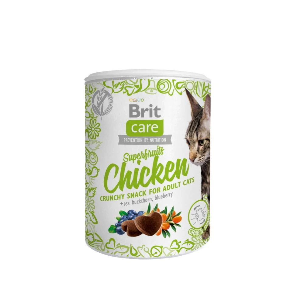 Wybierz przysmak Brit Care Cat Snack Superfruits, jeśli szukasz bezzbożowej przekąski z kurczakiem, rokitnikiem i borówką amerykańską do codziennego użycia.