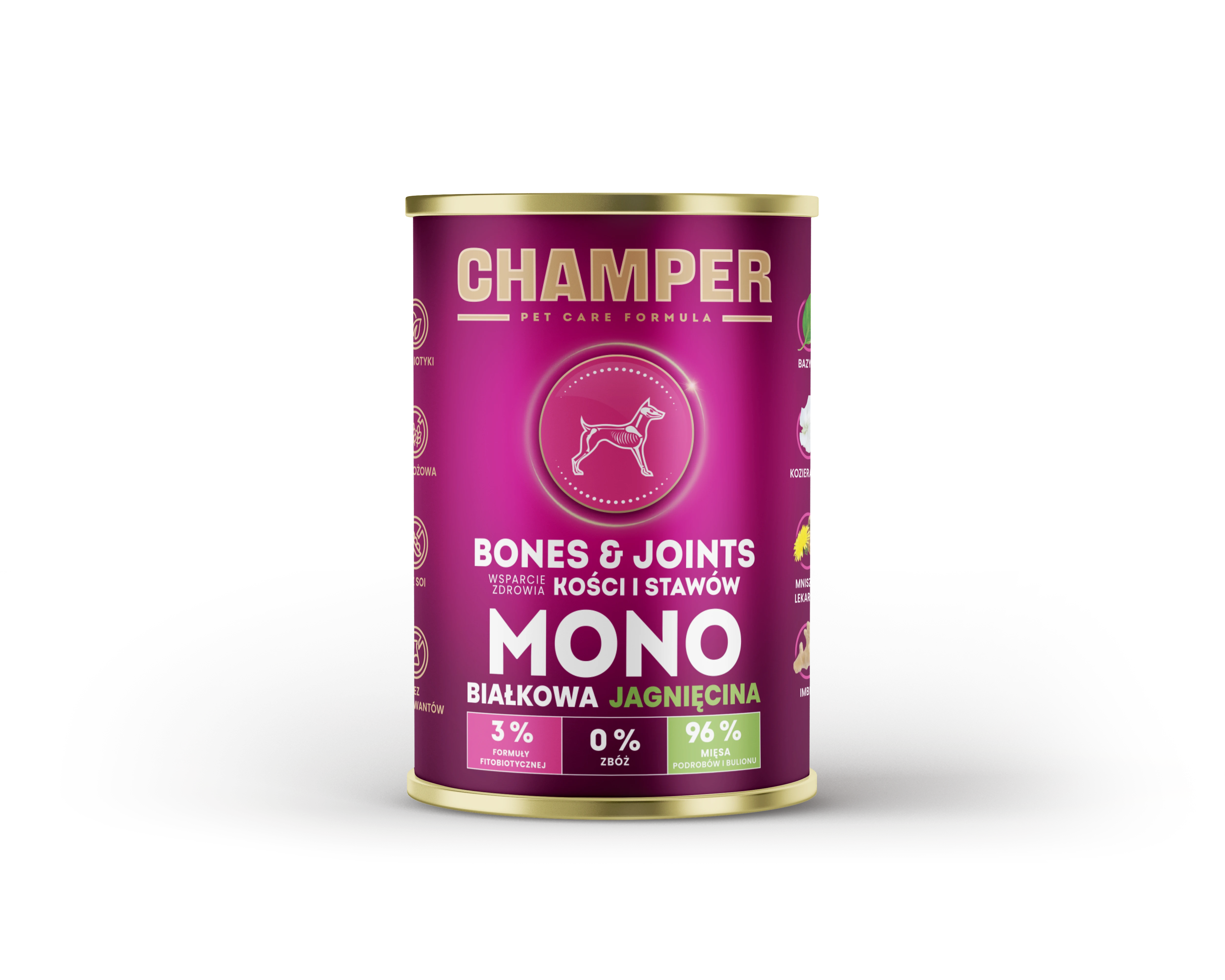 Mokra karma Champer z formułą Bones & Joints została stworzona specjalnie z myślą o psach, które potrzebują dodatkowego wsparcia zdrowia kości i stawów. Karma ta jest odpowiedzią na potrzeby dużych ras, psów starszych oraz tych, które prowadzą aktywny tryb życia. Nasza specjalnie zaprojektowana formuła fitobiotyczna, dzięki sile naturalnych ziół, poprawia funkcjonowanie stawów, dbając jednocześnie o codzienny komfort Twojego pupila.