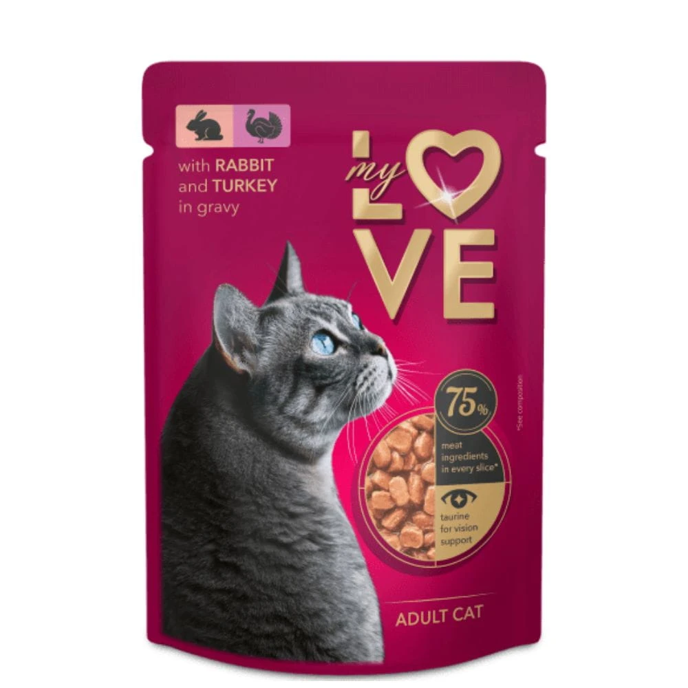 Wybierz My Love, jeśli szukasz pełnoporcjowej karmy mokrej dla dorosłego kota z królikiem i indykiem w sosie oraz wygodnej saszetki 85 g do codziennego użycia.