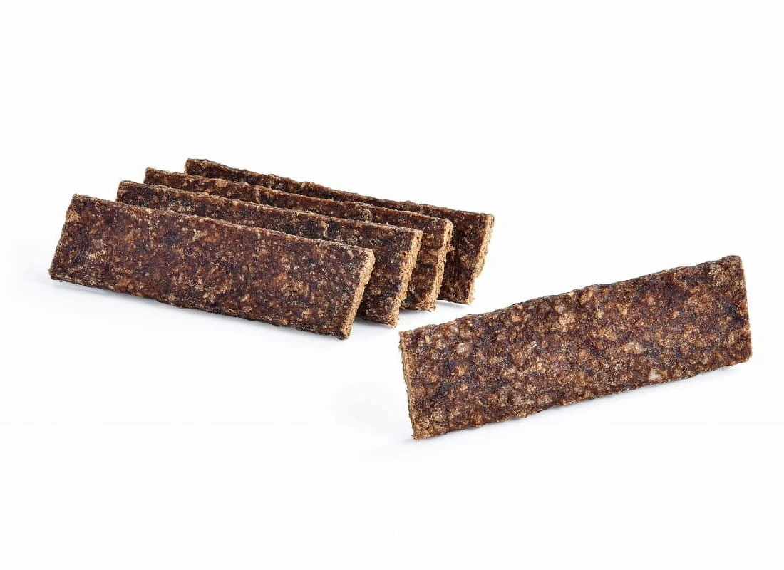 Bezzbożowa, monobiałkowa receptura, brak sztucznych dodatków i pasteryzacja termiczna to gwarancja jakości i bezpieczeństwa. Półmiękka struktura sprawia, że paski łatwo podzielić – świetnie sprawdzą się jako motywator podczas treningu. Opakowanie strunowe zapewnia świeżość i komfort użytkowania.