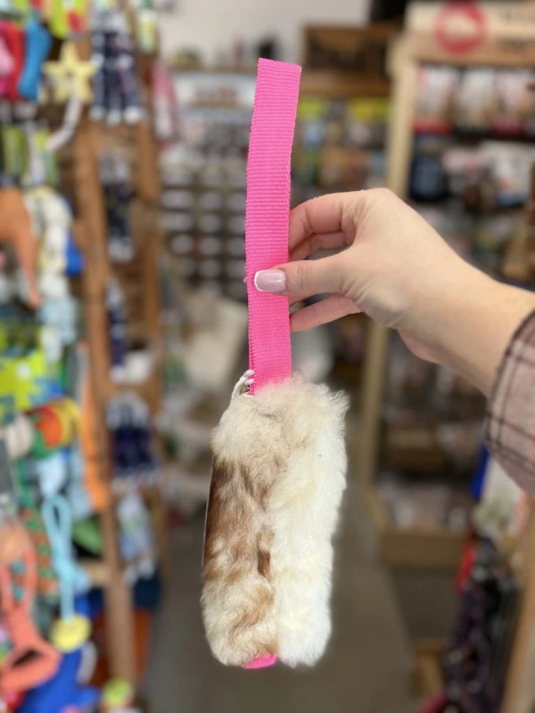 Ręcznie wykonany szarpak dla psa z naturalnego futra owczego z krótką rączką i różową taśmą. Sprawdzi się do zabawy i szkolenia, szczególnie podczas krótkiej, intensywnej pracy z psem; długość całkowita wynosi ok. 45 cm, a część z futrem ok. 20 cm.