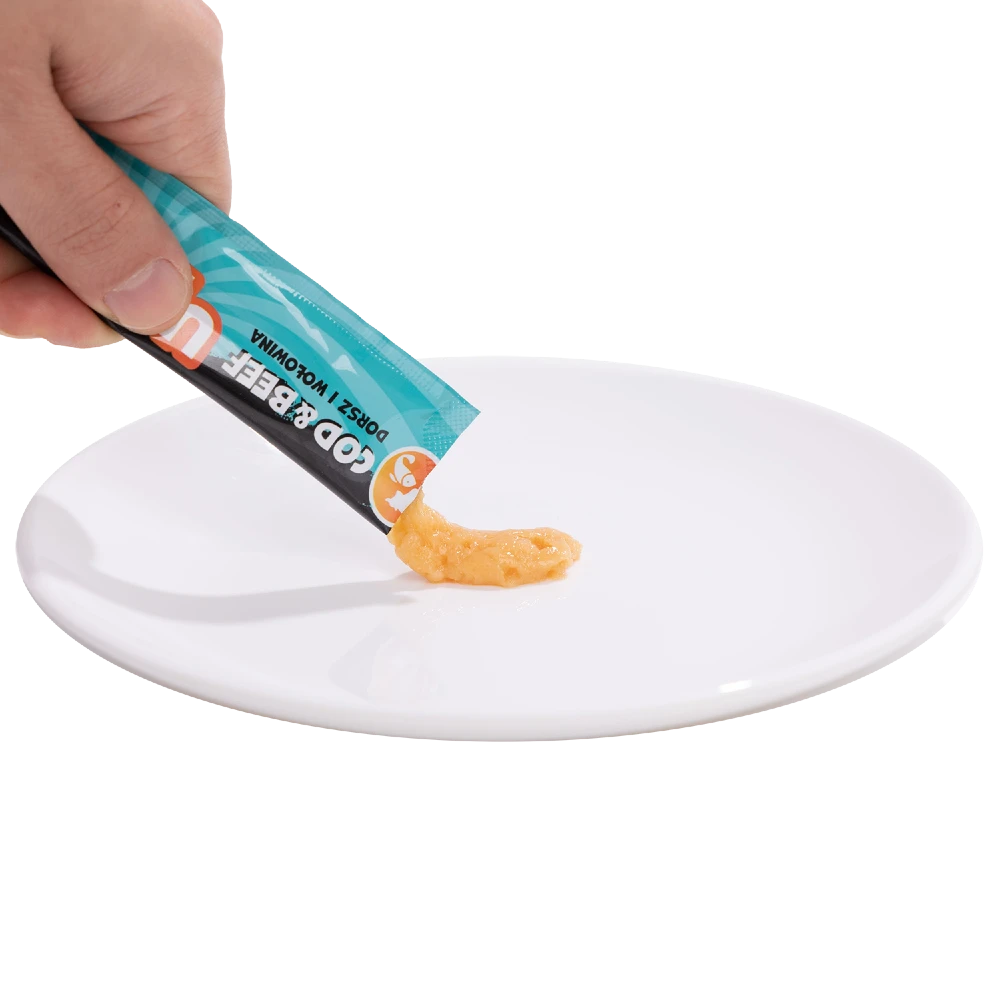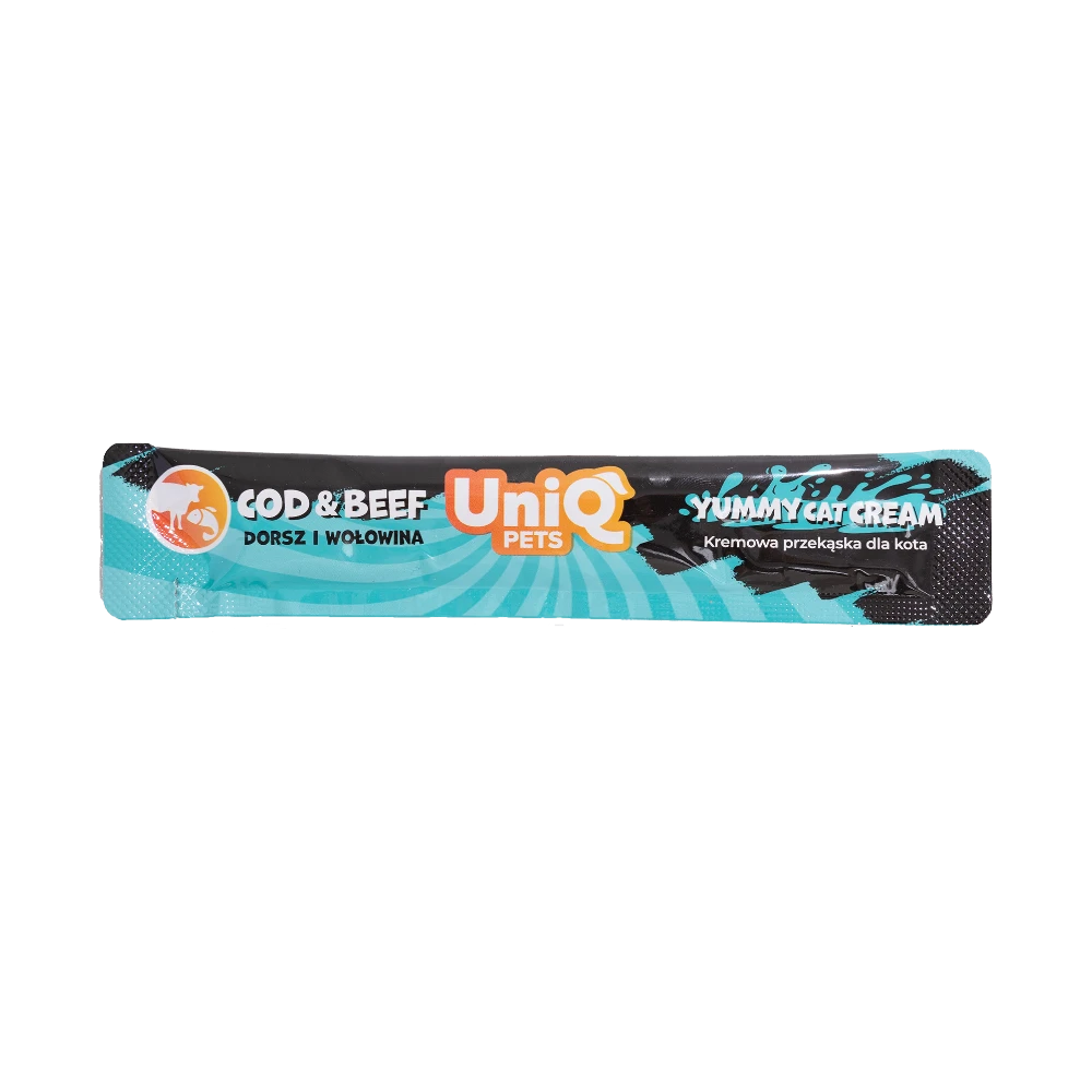 UNIQ PETS PurrCream to kremowa przekąska dla kota z dorszem i wołowiną, przeznaczona do okazjonalnego podawania jako element codziennej rutyny żywieniowej. Poręczna tubka pozwala na wygodne serwowanie bezpośrednio z opakowania lub jako dodatek do karmy.