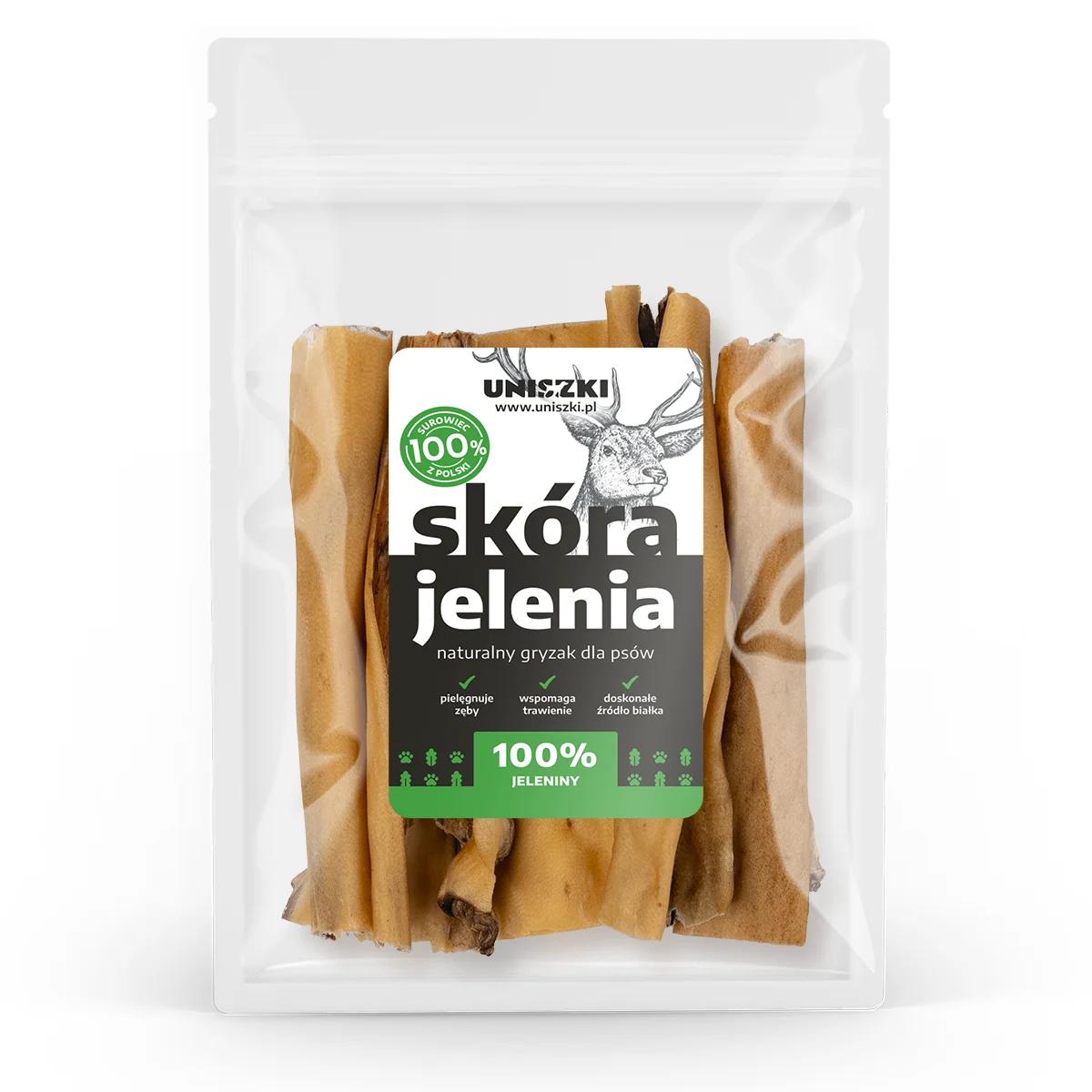 Skóra jelenia jako gryzak dla psów! Ta naturalna „przebojowa przekąska” nie tylko zapewnia godziny bezgranicznej zabawy dla Twojego pupila, ale ma również wiele korzyści. Skóra jelenia to prawdziwy trening dla szczęk. Skóra jelenia jest także naturalnym czyszczącym narzędziem dla zębów twojego psa. Kiedy pies gryzie i żuje tę skórę, działa jak szczoteczka do zębów, wycierając się o płytki nazębne i dając twojemu psu świeży oddech. Skóra jelenia to także doskonały gryzak do zaspokojenia psiego instynktu łowieckiego. I co najważniejsze, skóra jelenia jest zdrową przekąską dla Twojego psa. Nie ma w niej żadnych sztucznych dodatków, barwników czy konserwantów.