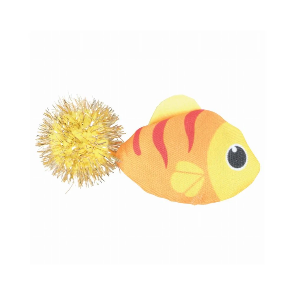 Forma ryby i połyskujące detale zwiększają atrakcyjność produktu podczas kontaktu z pupilem. Poliester sprawdza się w codziennym użytkowaniu, a kompaktowe wymiary 5,5 cm x 2,5 cm x 10 cm dobrze wpisują się w zabawy polegające na chwytaniu, noszeniu i polowaniu.