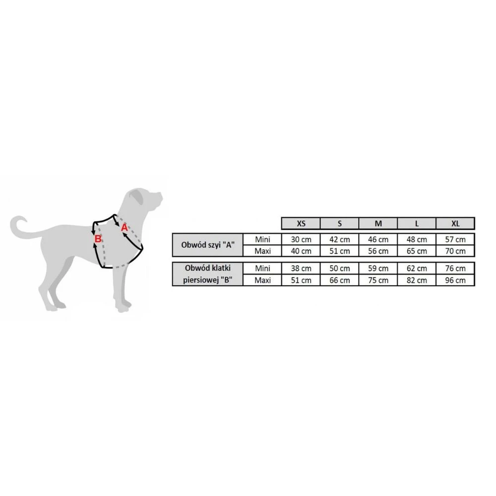 Rozmiar XS jest odpowiedni dla małych psów o obwodzie szyi 30 cm - 40 cm i obwodzie klatki piersiowej 38 cm - 51 cm.