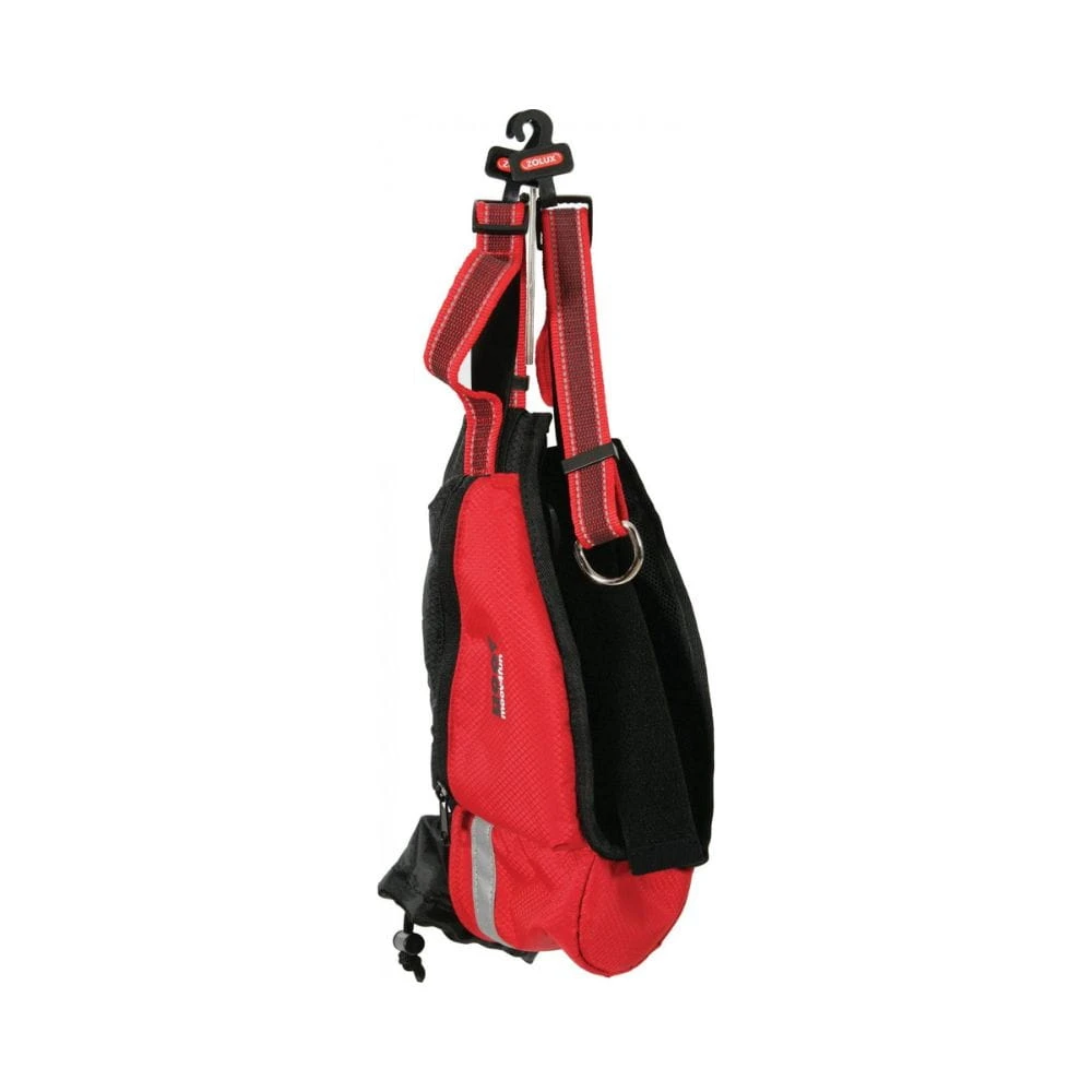 W konstrukcji uwzględniono dwie kieszenie zamykane na zamek błyskawiczny oraz specjalną kieszeń na butelkę. Wyróżnia go wodoodporne wykonanie, odblaskowe paski, możliwość podpięcia smyczy i element zapobiegający szarpaniu. Czerwony kolor nadaje całości wyrazisty, nowoczesny wygląd.