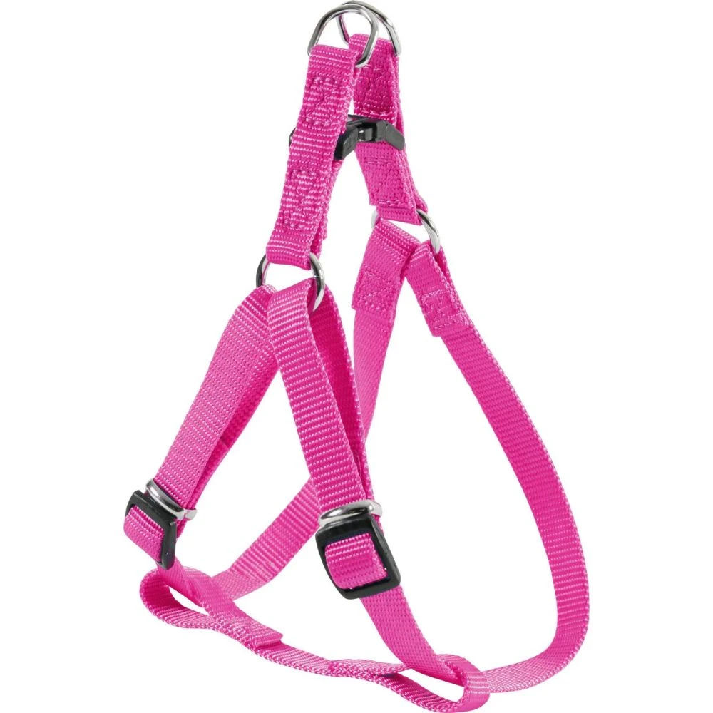 Szelki step-in dla psa w rozmiarze L i kolorze fuksja, przeznaczone dla dużych psów. Nylonowe wykonanie, regulacja, plastikowy zatrzask na plecach oraz 2 metalowe pierścienie ułatwiają dopasowanie i przypięcie smyczy.
