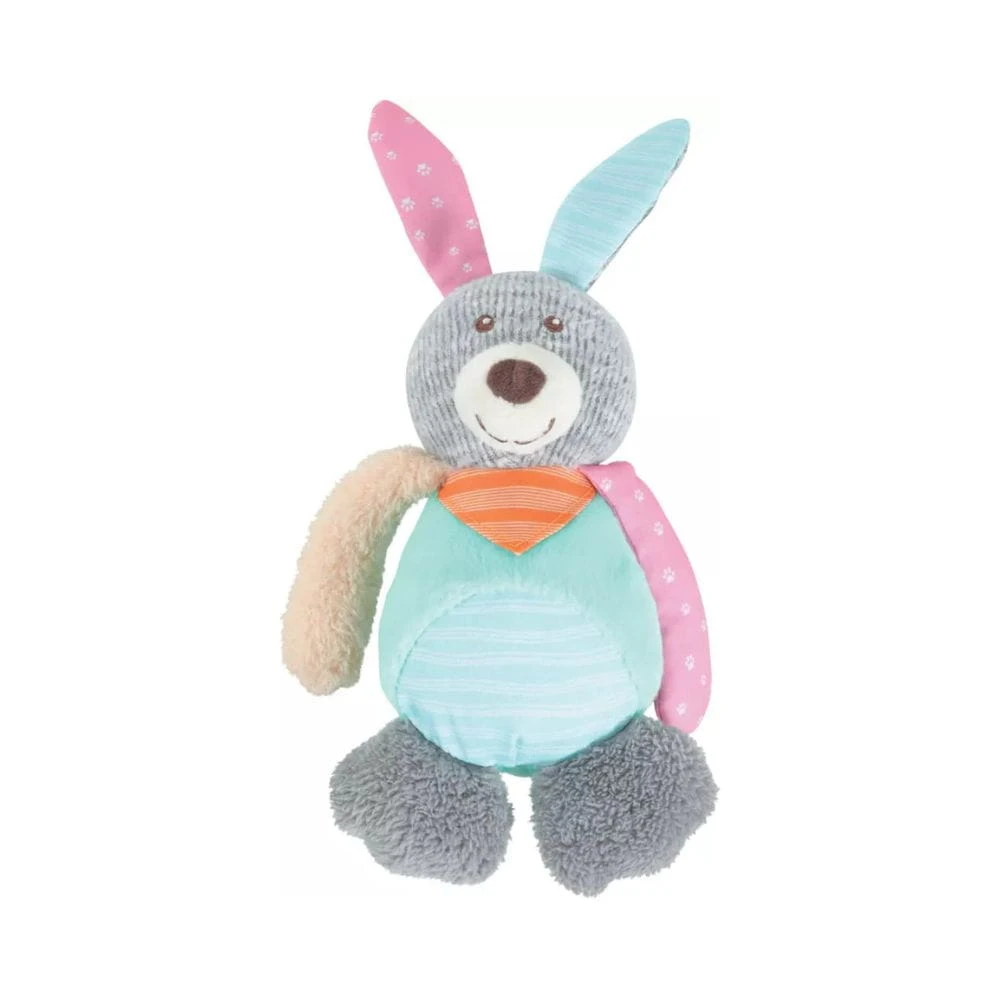 Pluszowa zabawka dla psa z piszczałką, w kształcie królika. Miękka przytulanka z kolorowych materiałów sprawdzi się podczas codziennej zabawy, noszenia i odpoczynku.