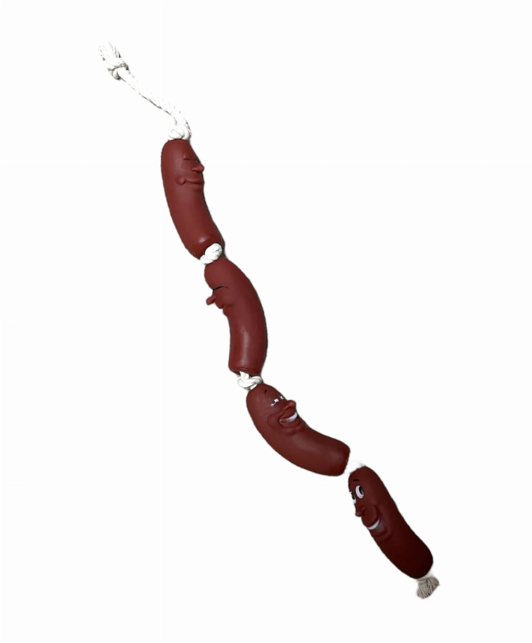 - Design kiełbasek na sznurku: Zabawka składa się z 4 kiełbasek zamocowanych na sznurku, co jest atrakcyjne i zachęcające dla psa do zabawy.
