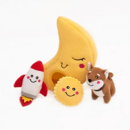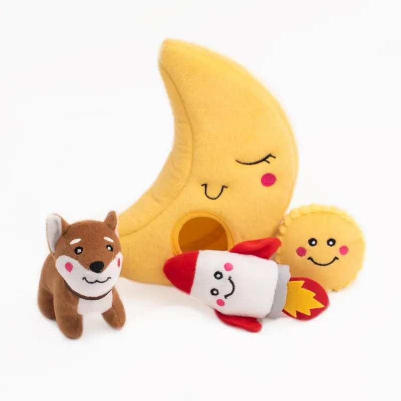 Wyprawa na księżyc? Teraz to możliwe z norką ZippyPaws! Usiądź wygodnie i obserwuj jak Twój pies przy pomocy nosa, pyska i łap wyławia pluszowe zabawki z wnętrza norki! Zestaw zawiera pluszową norkę w kształcie księżyca oraz trzy małe zabawki: rakietę, psa i monetę - każda z nich posiada piszczałkę.