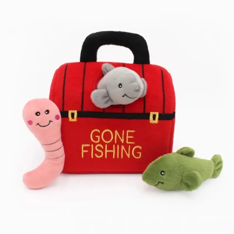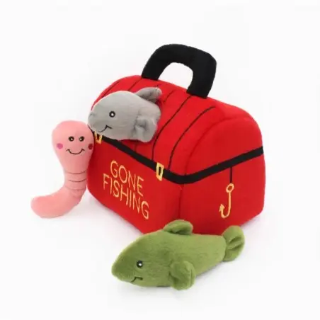 Interaktywna i angażująca pluszowa norka skrzynka na wyprawę wędkarską. Idealna dla psów ras średnich i dużych. Psy uwielbiają wciskać nosy w norki, aby wyniuchać i wyciągnąć z nich pluszowe zabawki! Dodatkową atrakcją są piszczałki we flaingach, które zachwycą Twojego pupila!